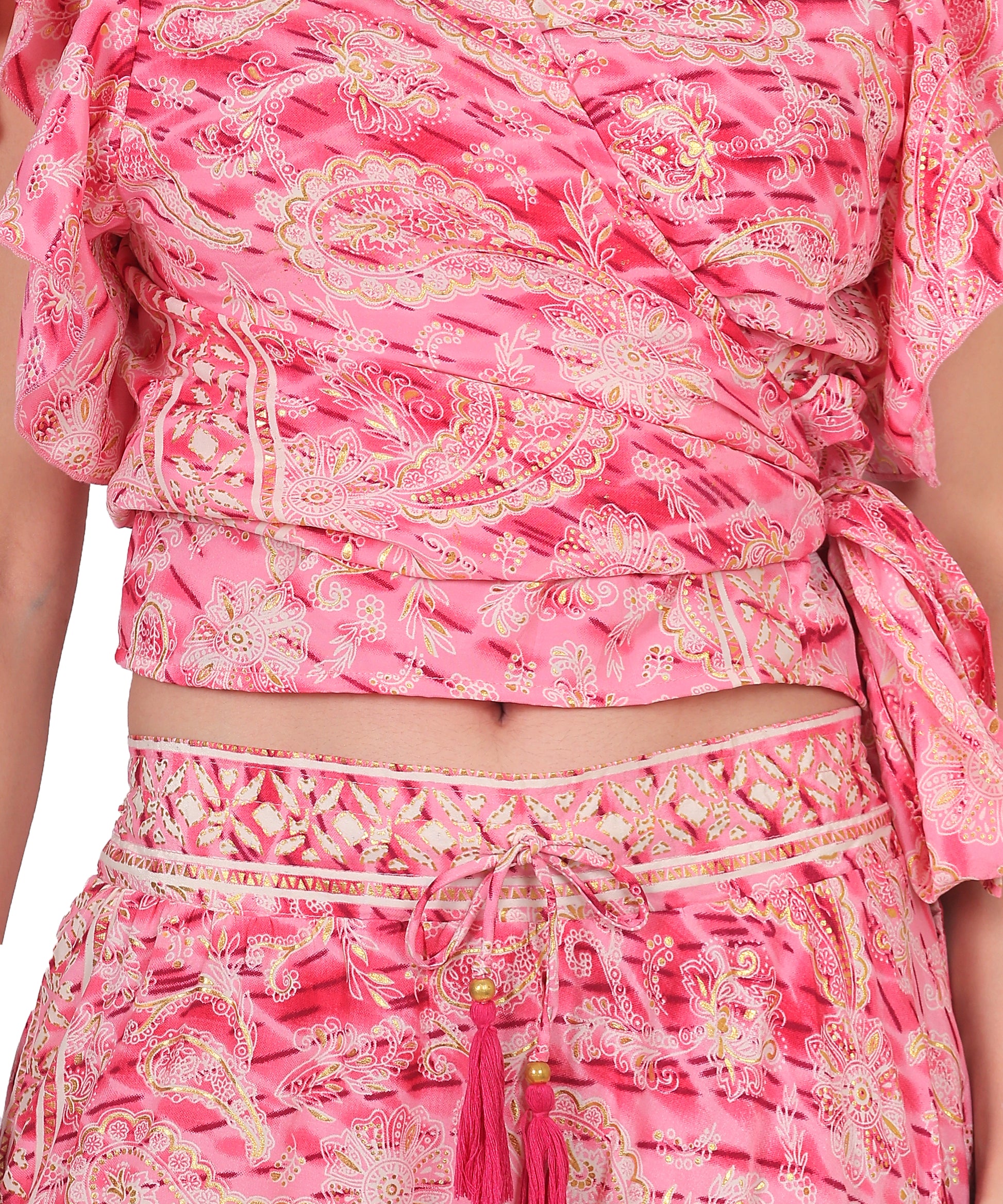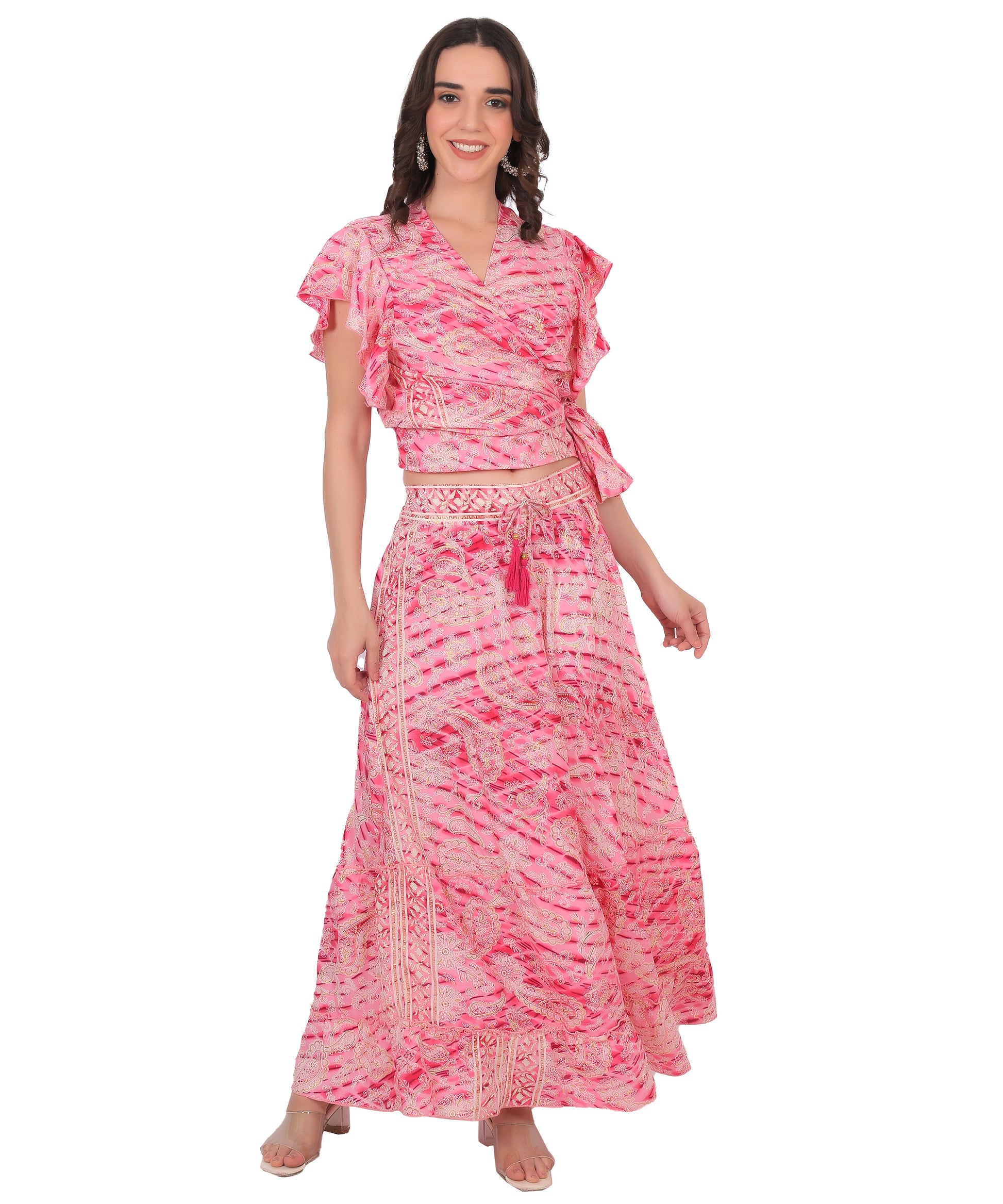 silk co-ord set, top and skirt set, Ibiza partywear, boho silk outfit, women’s silk two-piece set, OEM fashion manufacturer India, white label exporter Delhi,
