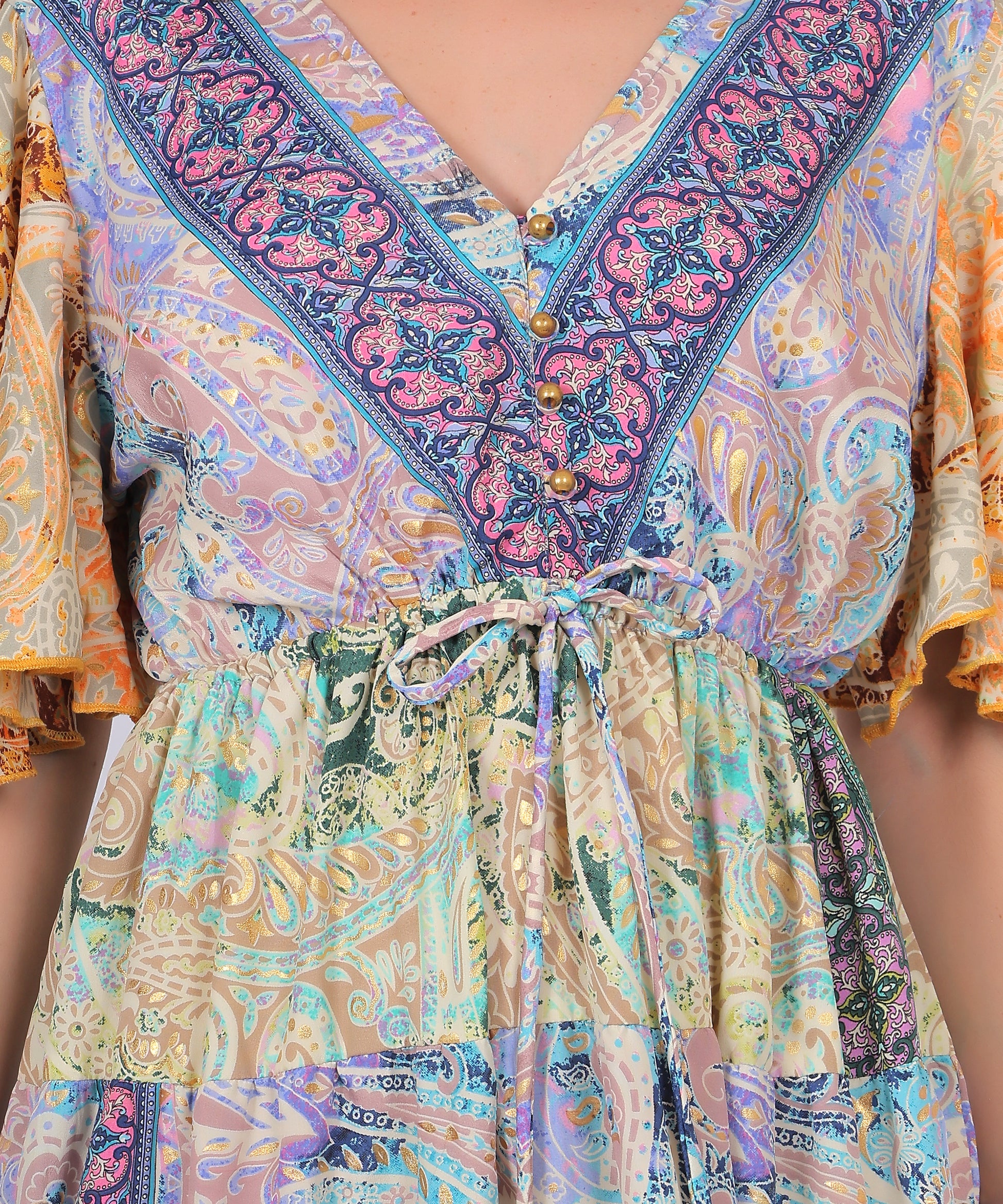 vestido largo de seda kasturi, vestido multicolor de seda, vestido estilo Ibiza, moda boho India, fabricante ropa OEM, proveedor marca blanca,