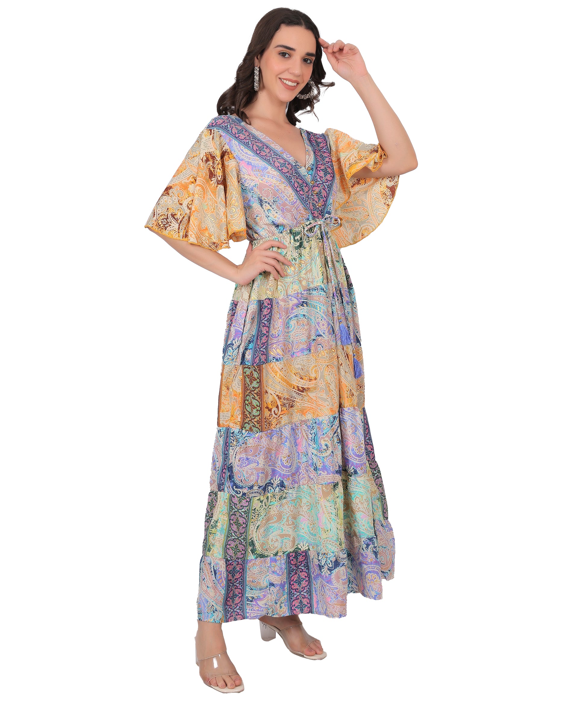 kasturi zijden lange jurk, meerkleurige print jurk, Ibiza feestjurk, boho mode fabrikant India, OEM damesmode, white label kleding,